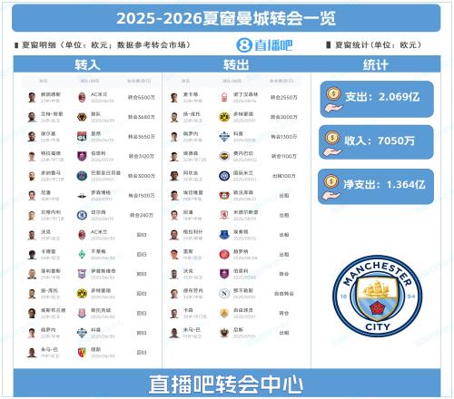 瓜氏曼城新高曼城本赛季总支出将破3亿欧此前9赛季最高3.175亿