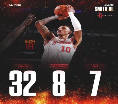 全场比赛小贾巴里-史密斯41分钟,21中11,三分13中7,罚球4中3,拿到32分8篮板1盖帽,命中率52.4%,三分命中率53.8%,正负值+21。