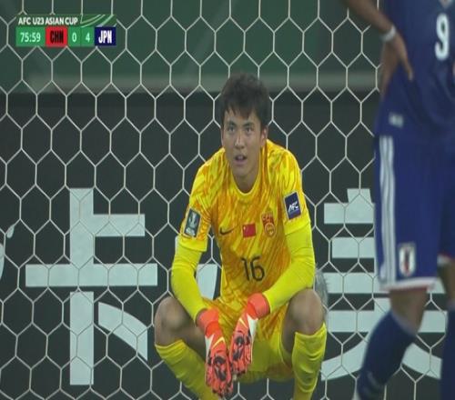 体育播报01月25日宣 U23亚洲杯决赛,中国男足U23对阵日本U23,U23国足第76分钟0-4落后,李昊丢球后无奈蹲地摇头。