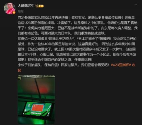 体育播报01月25日宣 U23亚洲杯决赛,中国男足U23不敌日本U23,收获赛事亚军,这是队史参赛的最佳战绩。赛后,韩乔生对比赛进行了评价。