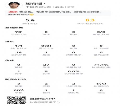 体育播报1月25日宣 U23国足在U23亚洲杯决赛0-4完败于日本,左翼卫胡荷韬本场数据如下:
