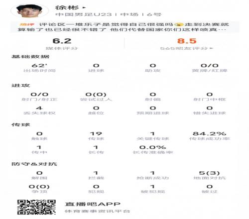 中国队首发中场徐彬全场数据方面,媒体评分6.2,吧友评分8.5,出场时间62分钟,丢失球权4次,传球19次,关键传球1次,传球成功率84.2%,传中1次,长传1次,拦截1次,抢断成功1次,地面对抗5(3)次,被犯规1次。