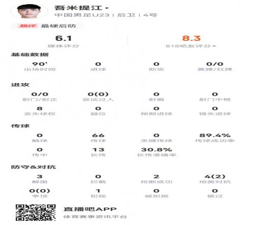 体育播报1月25日宣 U23国足在U23亚洲杯决赛0-4完败于日本,右中卫吾米提江本场数据如下: