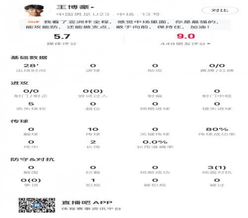 王博豪全场数据:1次成功地面对抗+传球成功率80%,评分5.7分