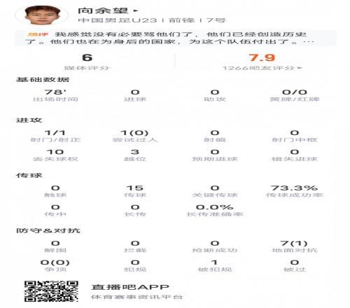向余望,媒体评分6,吧友评分7.9,出场时间78分钟,射门1次,射正1次,尝试过人1次,丢失球权10次,越位3次,传球15次,传球成功率73.3%,地面对抗7(1)次,被犯规1次。