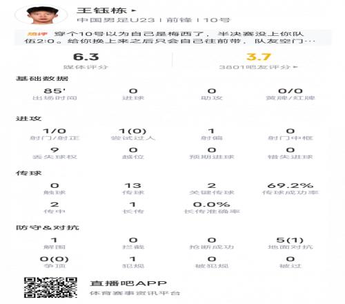 中国队首发前锋王钰栋的全场数据方面,媒体评分6.3,吧友评分3.7,出场时间85分钟,射门1次,尝试过人1次,射偏1次,丢失球权9次,传球13次,关键传球2次,传球成功率69.2%,传中2次,长传1次,解围1次,地面对抗5(1)次,犯规1次。