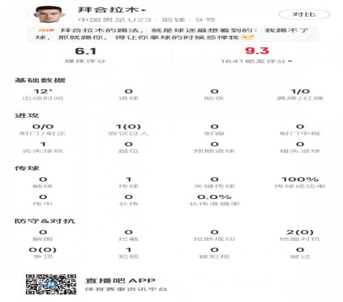 拜合拉木全场数据:出场12分钟1传球1犯规+染黄,评分6.1分